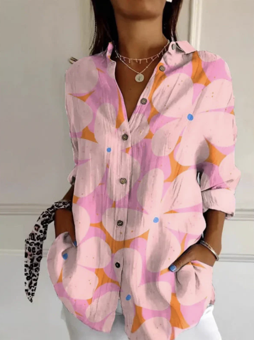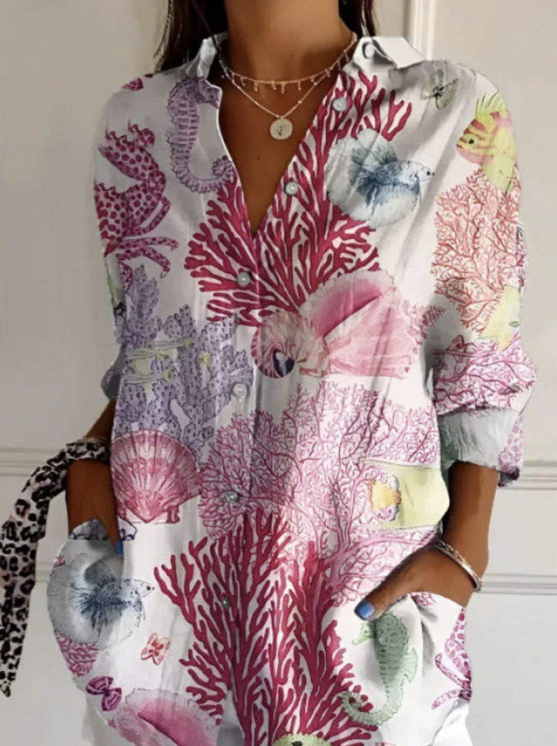 Denne lette bluse skiller sig ud med sit kunstneriske print og sin luftige pasform, der forsigtigt følger dine bevægelser. Ideel til solrige dage eller afslappede udflugter, kombinerer den komfort og originalitet med subtilitet. Dens boheme-chic stil tilpasser sig alle dine ønsker.