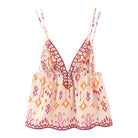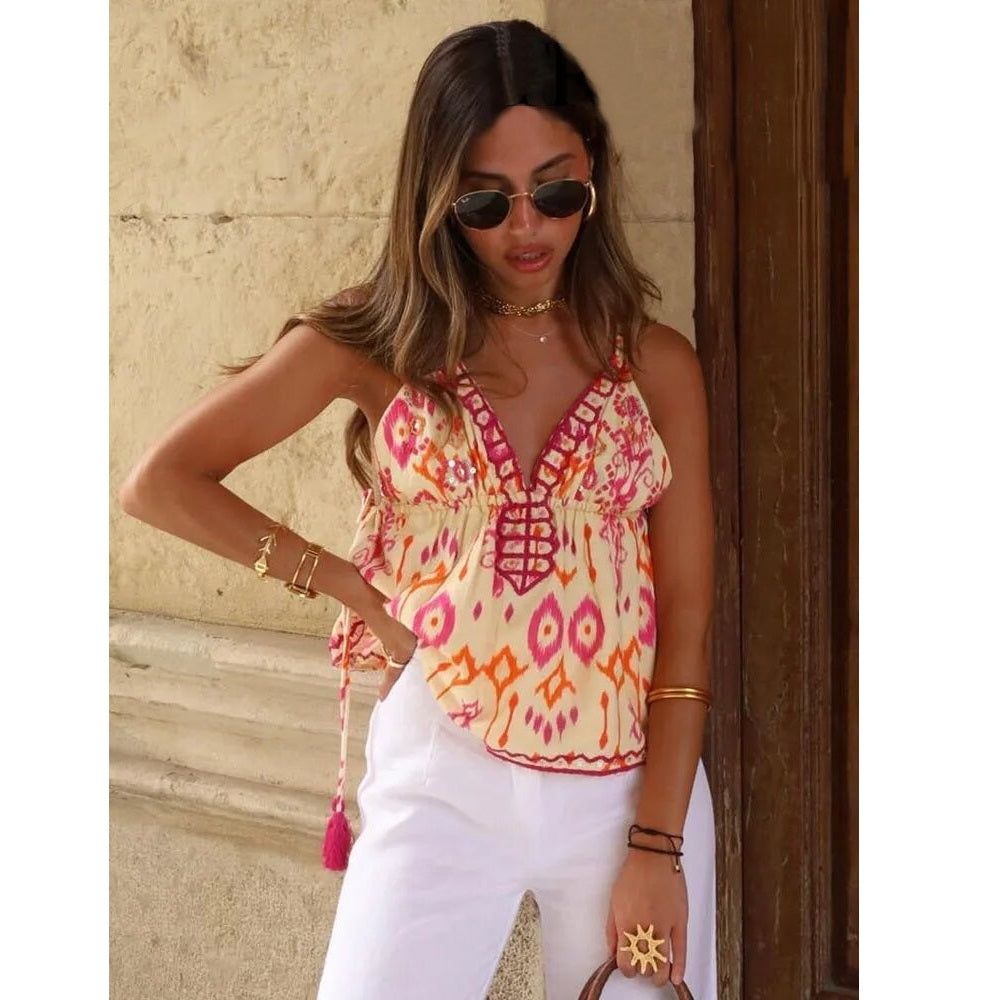 Denne ærmeløse bluse tiltrækker med sit mønster inspireret af aztekisk kunst og sine strålende farver. Let og flydende, den er perfekt til solrige dage, der kombinerer komfort og afslappet stil.