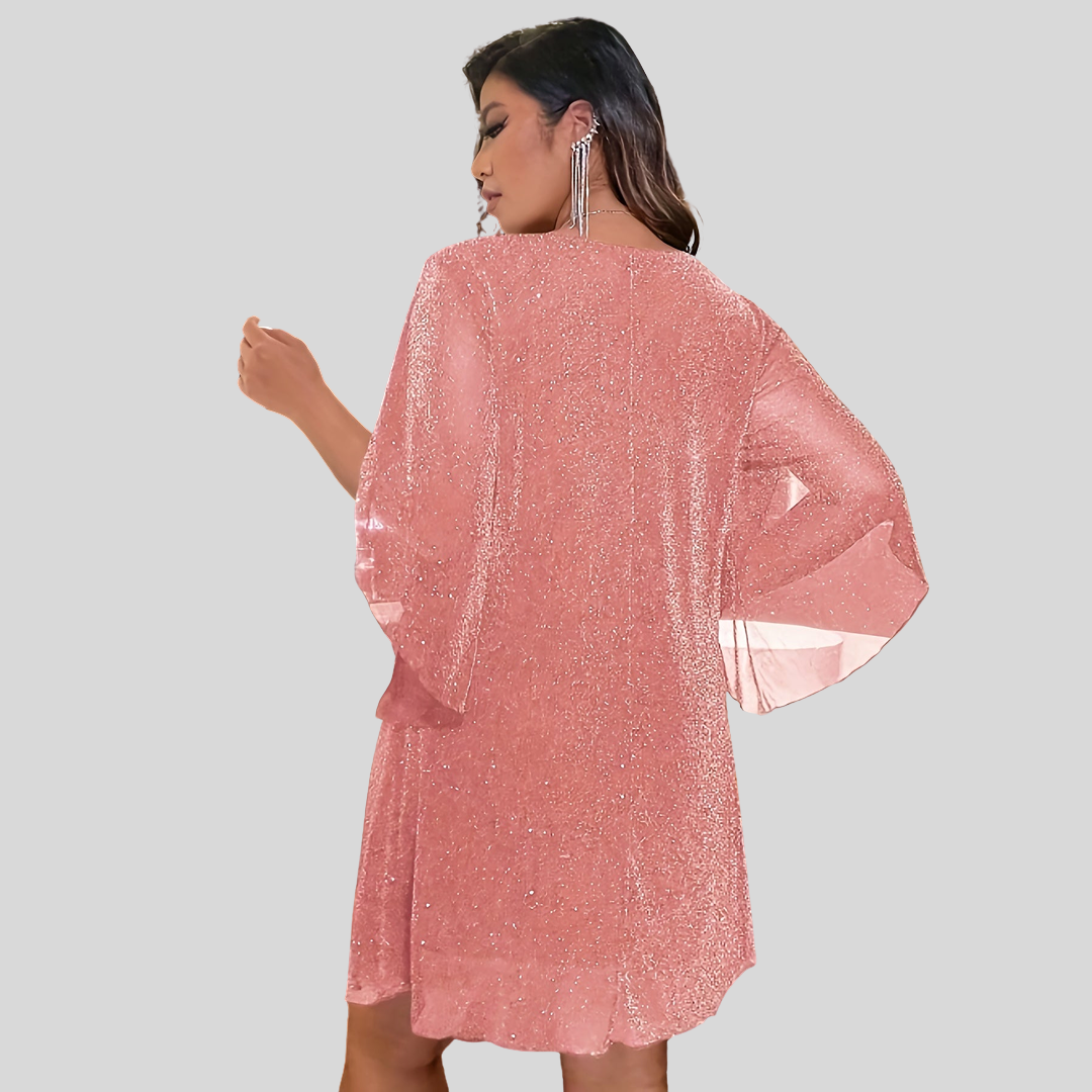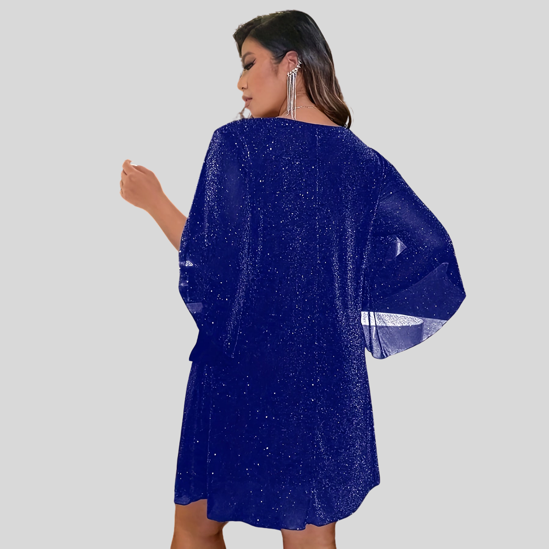 Tämä lyhyt kimaltava mekko on täydellinen iltoihisi. Sen V-mallinen kaula-aukko korostaa siluettiasi. Saatavilla useissa väreissä ja kooissa.