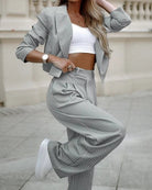 Cet ensemble associe un blazer structuré à un pantalon assorti. Il offre une silhouette élégante et professionnelle. Parfait pour le bureau ou des occasions formelles.