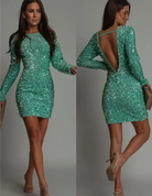 このフィットしたドレスは、グラマラスな効果を与えるきらめくスパンコールで飾られています。背中が開いたデザインは官能的なタッチを加えます。特別な夜やイベントに最適です。