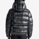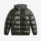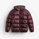 Denne korte dunjakken fremhever en skinnende tekstur som umiddelbart gir en moderne stil. Den voluminøse passformen og de brede relieffpanelene gir et strukturert utseende, perfekt for kalde dager. Den integrerte hetten og den helåpne glidelåsen gjør den til et praktisk plagg å ha på seg til daglig.