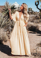 Ta długa, zwiewna sukienka ma luźny i lekki krój. Jej głęboki dekolt podkreśla sylwetkę. Idealna na letnie dni lub eleganckie wieczory.